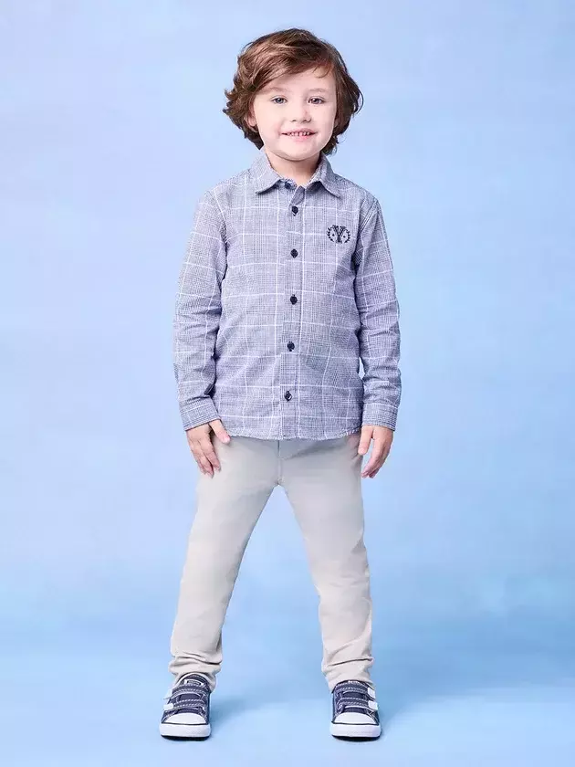 Elegância e conforto para os pequenos! A camisa azul xadrez com bordado discreto no peito é acompanhada por uma calça bege de tecido leve e ajuste na cintura. Um conjunto perfeito para eventos especiais ou ocasiões mais formais.